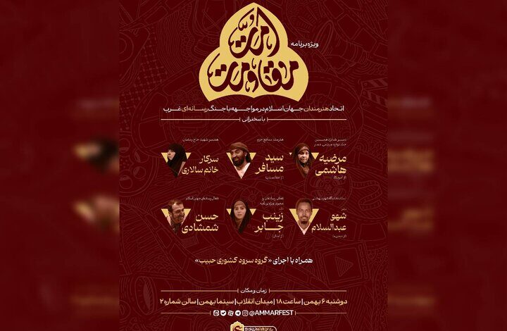 به گزارش خبرگزاری مهر به نقل از روابط عمومی جشنواره، این برنامه با حضور مرضیه هاشمی دبیر شانزدهمین جشنواره مردمی عمار (از آمریکا)، سید مسافر هنرمند مدافع حرم (از افغانستان)، سالاری همسر شهید حاج رمضان، شهو عبدالسلام استاد دانشگاه شهید بهشتی (از نیجریه)، زینب جابر فعال رسانهای و مجری ویژهبرنامه (از لبنان)، حسن شمشادی فعال رسانهای جهان اسلام برگزار میشود.