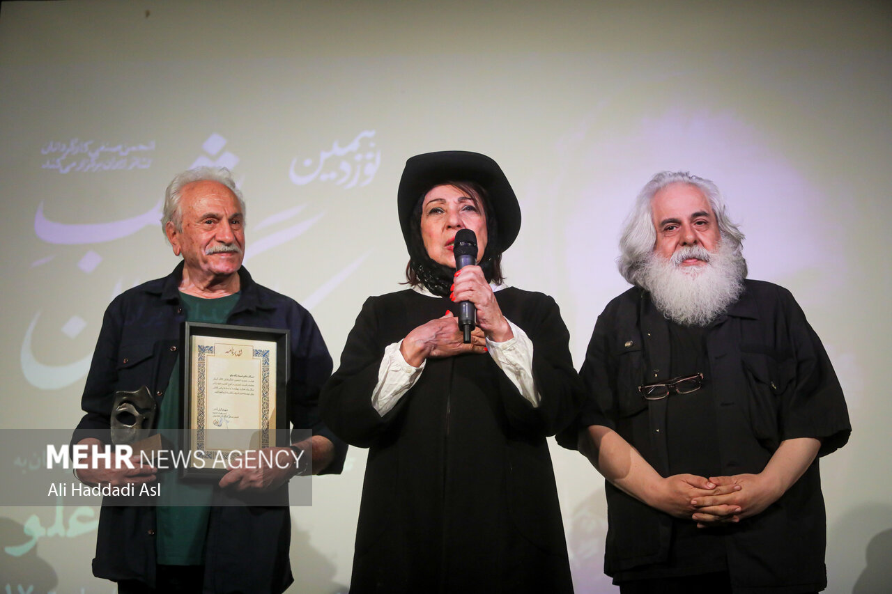 سپس متن لوح قدردانی از ژاله علو را قرائت کرد و ایرج راد به نمایندگی از ژاله علو لوح و نشان مدنظر را دریافت کرد.